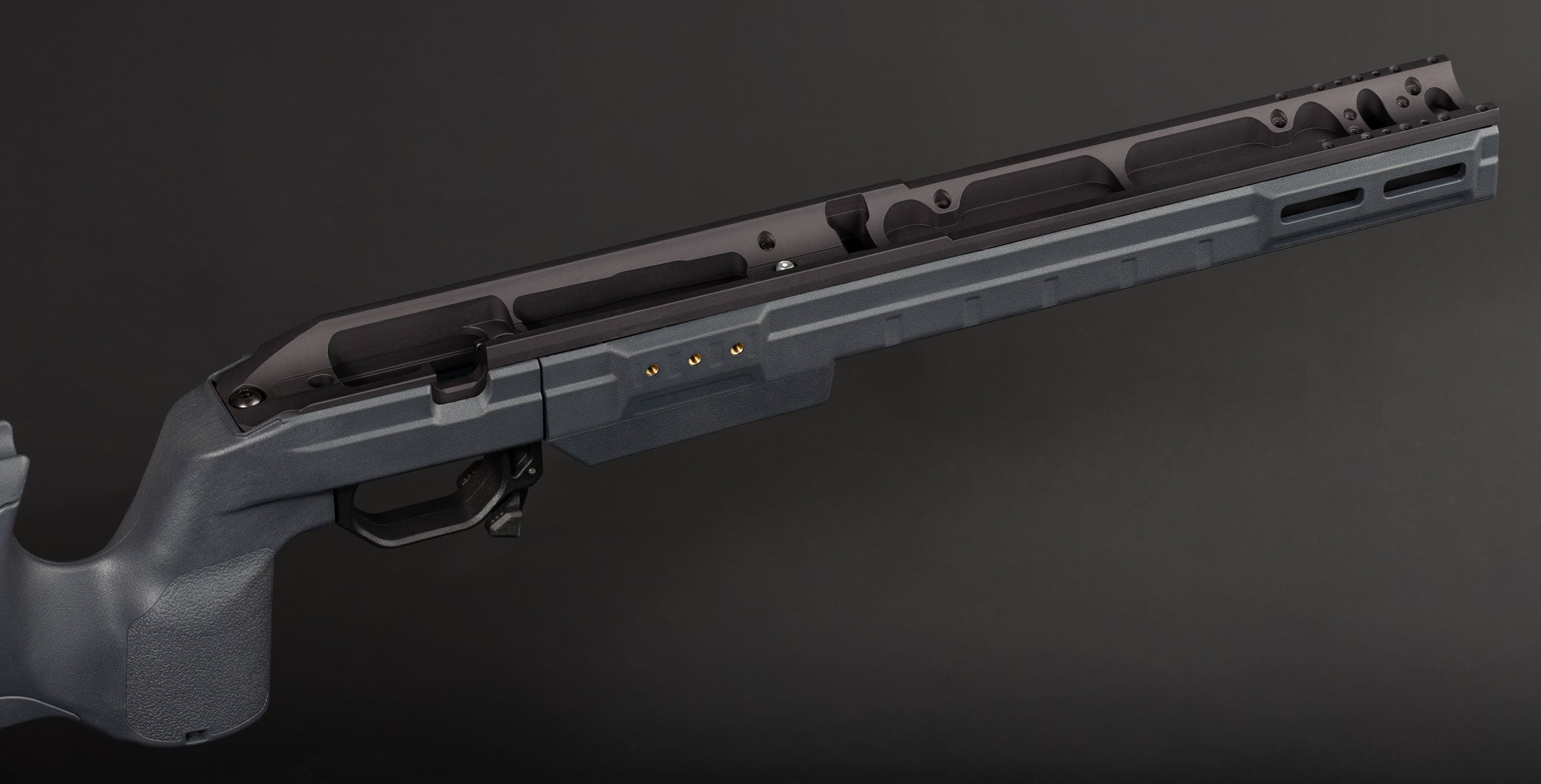 • Radius bedding system which is CNC’d into aluminum for consistent contact between action and chassis.